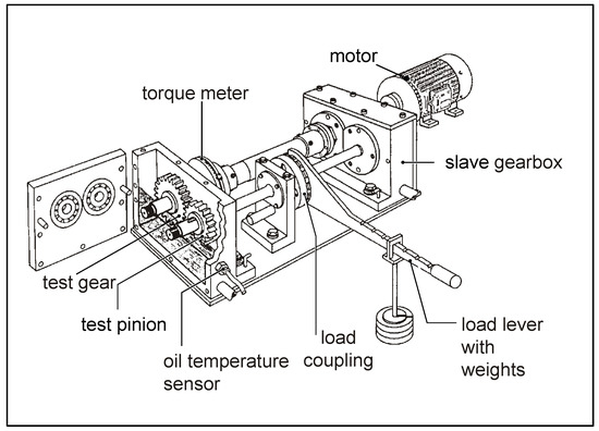The FZG scuffing test is conducted on the FZG back-to-back test rig, according to ISO 14635-1 [26]. Figure 2 shows the design of the test rig. The test rig consist of test gears and slave gears with an identical gear transmission ratio. The test gears and the slave gears are connected through two torsional shafts. The pinion of the test gear and the pinion of the slave gear are mounted on the same shaft and the wheel of the slave gear as well as the wheel of the test gears are located on the other shaft. The shaft between the pinions is divided into two parts that are connected by a coupling. While this coupling is opened at standstill, one coupling flange is fixed and the other flange is loaded with a lever and weights to introduce a static torque into the system. After locking the coupling, the lever is removed and the electric motor can be started. For adjusting the defined torque, the weights are hung on the loading arm. The motor only has to compensate the power losses in the system, which allows energy-efficient testing.