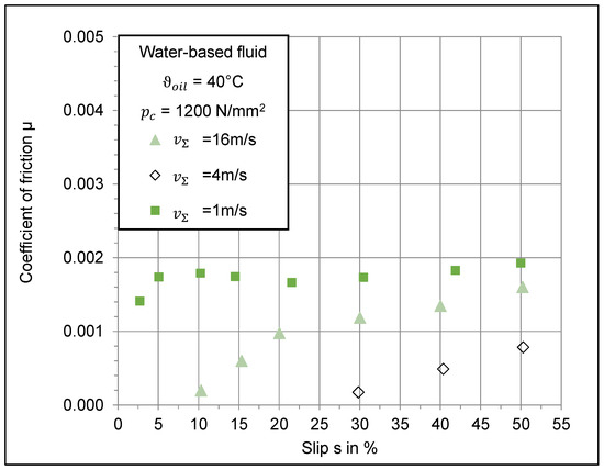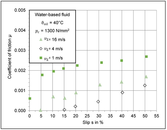 A comparison of the fluid sample based on water and plant extract with mineral oil and synthetic oil is illustrated in Figure 6. The mineral and synthetic oil were compounded with additives. The mineral oil had a kinematic viscosity of 95 mm2/s at 40 °C. For the synthetic oil, an oil based on PAO with a kinematic viscosity of 64 mm2/s at 40 °C was used. The reference values of the mineral and synthetic oil were conducted at the institute with a lubricant temperature of 40 °C, a Hertzian contact stress of 1200 N/mm2, and a sum velocity of 16 m/s on the twin disk test rig. It can be seen that the fluid sample based on water and plant extract showed, under the same test conditions, values of the coefficient of friction in the range of about 1/25 of typical values determined for mineral oils. Thus, a reduction of load-dependent power losses in the range of 90% can be expected. Compared to the PAO, significantly lower values for the coefficient of friction were reached with the water-based fluid.