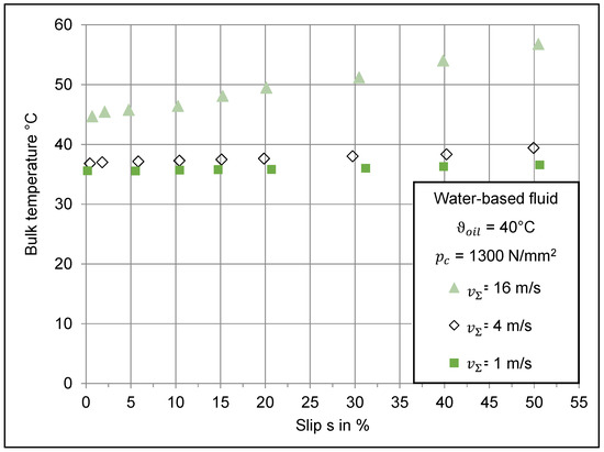The coefficient of friction was determined at a lubricant temperature of 40 °C and Hertzian contact stress of 1300 N/mm2 and 1200 N/mm2. The slip was increased for every test from 0% to 50%. The measurements for every test were conducted at a sum velocity of 1 m/s, 4 m/s, and 16 m/s. Figure 3 shows the coefficient of friction measured at 1300 N/mm2 and Figure 4 shows the coefficient of friction at 1200 N/mm2. It can be seen that the values for both stresses are far below 0.005. The coefficient of friction for a sum velocity of 4 m/s appears to be slightly lower than for a sum velocity of 1 m/s and 16 m/s. The values for a sum velocity of 1 m/s are located slightly above the values of a sum velocity of 4 m/s and 16 m/s. Nevertheless, the difference between the measured values of the different sum velocities are on a very low level. Figure 5 visualizes the measured bulk temperature of the upper disk. For a sum velocity of 1 m/s and 4 m/s, temperatures below but close to 40 °C were determined. The investigation showed bulk temperatures between 40 °C and 60 °C for a sum velocity of 16 m/s. The measurements with a Hertzian contact stress of 1200 N/mm2 showed comparable results for the bulk temperature.
