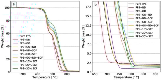 The thermal degradation curves of the samples of the first series (see Table 1a) are illustrated in Figure 3. As evident from Figure 3b, the oxidative degradation of the polymer is generally delayed to a higher temperature by the addition of the carbon based reinforcements. The respective decomposition curves show to be effectively shifted to a higher temperature. The degradation temperatures of 10%, 50% and 90% mass loss are presented in Figure 4 as t, t and t, respectively. The results indicate that especially at a higher mass loss an increase in degradation temperature is present by the addition of GO and SCF. The delay in thermal degradation can be related to the higher thermal stability of the used reinforcements []. The t temperature of 706.0 C for pure PPS, as presented in Table 2, was increased to 717.0 C by the addition of GO and to 753.0 C by using 10% SCF as reinforcement. The addition of ND interestingly provided slightly lower thermal stability when used as sole reinforcement. In combination with 10% SCF however, the degradation temperatures were increased with respect to the solely 10% SCF reinforced PPS, from 753.0 C to 771.9 C for the t temperature. The addition of SCF clearly protected the polymer from thermal decomposition as a function of its content. This effect may be explained by the higher heat absorption capacity of SCFs [].