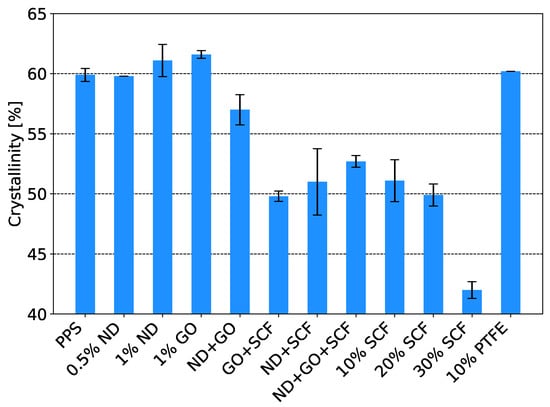 The degree of crystallinity of the different materials is presented in Figure 6. Only minor changes in the degree of crystallinity of the composites were identified by addition of the nano-reinforcements. This indicates that the nano reinforcements do not hinder the molecular chain mobility and formation of the crystalline phases, likely due to their small size and good dispersion. The addition SCFs does show to decrease the crystallinity as a function the SCF content in the polymer. This effect may be attributed to the fact that the particles are much larger, hindering the crystallization of the polymer. The addition PTFE did not influence the degree of crystallinity of PPS at the tested percentage.