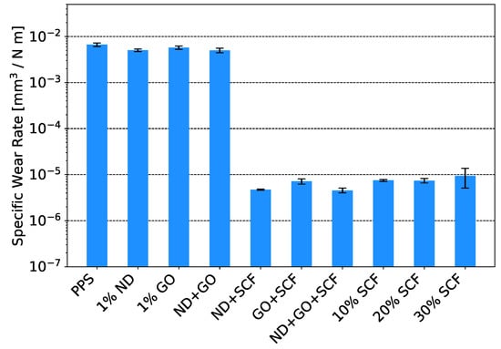 The specific wear rates of the tested materials are presented Figure 9. For the addition of SCFs, a drastic reduction in specific wear rate was observed, in the order of ∼103. Interestingly, the 10% SCF sample provided the lowest specific wear rate of the three tested percentages. When compared to the 10% SCF sample, the 20% and 30% exhibited a specific wear rate higher with a factor 2.2 and 11.3, respectively. At these higher SCF loadings, agglomerates were more likely to form which, due to the absence of a strong bonding between the fibres, act as potential weak spots in the material. The addition of both NDs and GO did not induce a clear reduction in wear rate. However, in combination with 10% SCF, a synergistic effect was observed by the addition of NDs. The multi scale composite reinforced with NDs and SCFs had a specific wear rate 40% lower than the 10% SCF reinforced PPS. The multi-scale composites with added NDs provided the lowest friction and wear characteristics of all tested materials.