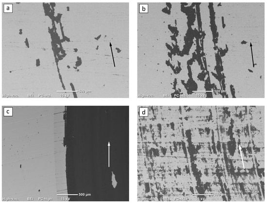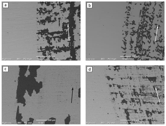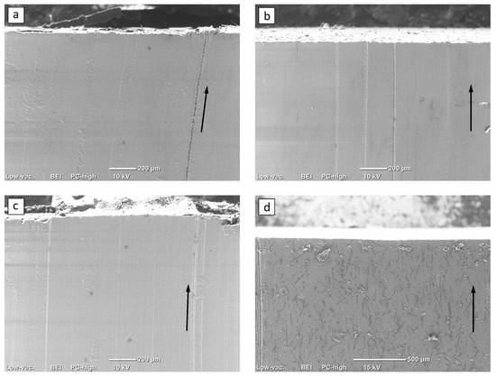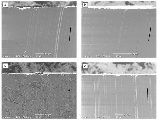 By inspecting the polymer pin surface, abrasive wear was identified as the most dominant wear mechanism under water lubricated conditions for both tested contact pressures. Grooves originating from the repetitive contact with the counter surface asperities are clearly visible as can be seen in Figure 17. The embedded SCFs are prominently present on the bearing surface and are expected to take up a large part of the load which corresponds to the found reduction in friction and wear. The wear mechanism for the SCF filled samples showed to be more dependent on shear thinning of embedded fibers. The addition of NDs in combination with SCF shows to protect the SCFs from extensive thinning by acting as a barrier between the two bearing surfaces [,]. For the sole ND reinforced samples a more smooth surface was observed with respect to pure PPS which indicates a polishing effect of released NDs, reducing both friction and wear [], see Figure 18.