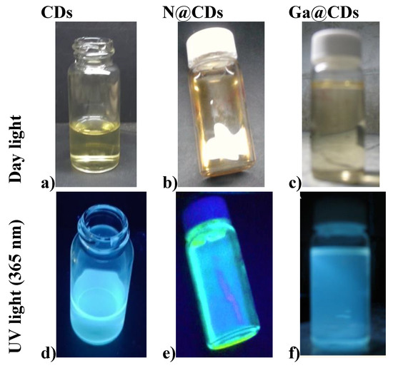 Photographs of CDs, N@CDs, and Ga@CDs suspensions under daylight (a,b,c) and UV-light (d,e,f).