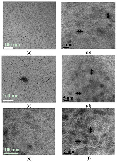 TEM images of CDs, N@CDs and Ga@CDs NPs (Figure 3) show that the particles are in the size-range of 4–9 nm. Comparing the images of pristine CDs to those of N@CDs, and Ga@CDs indicates that doping does not affect the particles’ size.