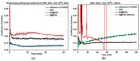 Figure 8 summarizes the calculated scuffing resistance for tested lubricants. It can be seen that the load carrying capacity for N@CDs is higher by an order of magnitude compared to the reference base oil or CDs and Ga@CDs. The application of N@CDs improved the scuffing resistance at least 15 times, and the lubricant provides incredibly stable lubricious film separating steel/steel surfaces from seizure.
