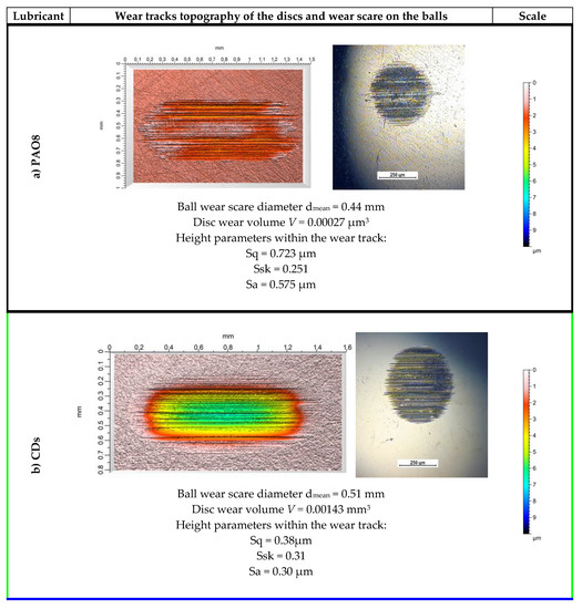 Disc and ball wear of the tested pairs for the different lubricants.