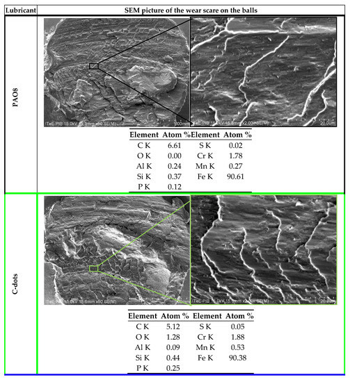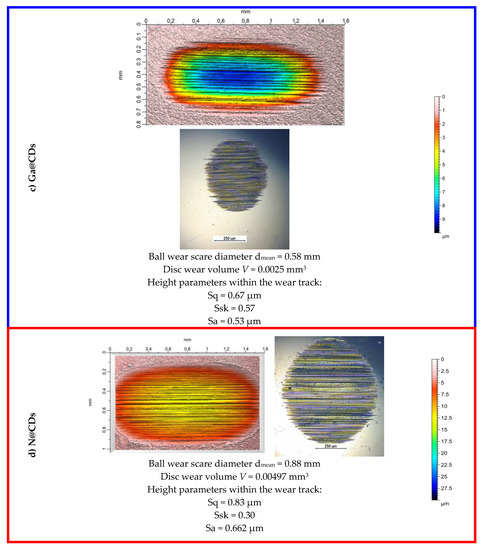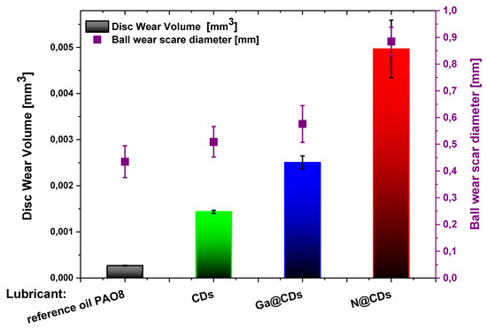 The results of the wear tracks’ optical analysis are presented in Figure 6, where the discs wear volumes and the balls wear scare diameters are correlated with the tested lubricants. From both Figure 4 and Figure 5 it is evident that C-nanodots do not exhibit AW performance. The reference oil PAO8 has a lower wear rate compared to the tested CDs.