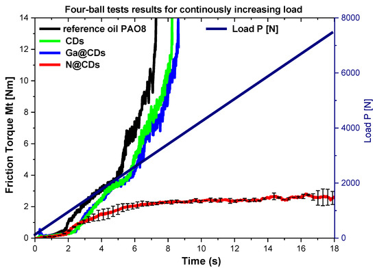 The properties of the tested lubricants related to the prevention of scuffing are called extreme pressure (EP) properties. A unique feature of the four-ball test method is related to the continuous increasing of the load until scuffing and then seizure occur, and to the ability of analyzing the scuffing propagation. During each run the friction torque Mt and the applied load are monitored as presented in Figure 7 vs. time. The test run continues until seizure occurs when 10 Nm friction torque is exceeded. The load at this point is called the seizure load, Poz. If 10 Nm is not reached (as in the case of the friction torque curve for N@CDs), the seizure is considered to occur in the end of the run, at the maximum possible load (about 7200N). Surprisingly, for the lubricant which had the highest CoF and wear in SRV AW properties, the test method appears to be the best for performing EP lubricants. For the reference PAO8 oil, as well as for the CDs and Ga@CDs, the seizure load occurred already at 3000 N, 3200 N and 3300 N, respectively. Clearly, there is an extraordinary EP effect of N@CDs on the tribological properties of steel/steel tribosystem; seizure does not occur even at 7200N. These results were very reproducible. The error bars marked for the N@CDs curve (red color) were calculated for 3 test repetitions and are very narrow for the entire test duration.