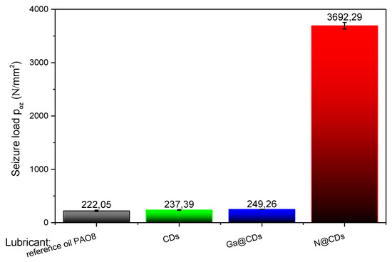 Limiting pressure of seizure (poz) obtained for steel/steel tribo-system lubricated with reference PAO8 oil, CDs, Ga@CDs, N@CDs.