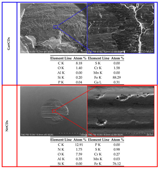 In an attempt to understand the wear mechanism for the steel tribo-system lubricated with CDs, SEM/EDX surface analyses were performed on the worn scare after the four-ball tester. The results are presented in Figure 9, showing two SEM images at different magnifications (50× and 2000×) and the EDX elementary analysis performed at the higher magnification spot for each of the lubricants. Examination of the results shows that the narrowest wear scare appears on the ball after the tests with N@CDs-lubricant. This is in agreement with the observation that this fluid provides the lubricious tribo-film appearing at very low friction torque (Figure 7, red curve) and highest scuffing resistance (Figure 8, red column). The N@CDs did not show any instabilities during the test, resulting in extremely narrow wear scare diameter, always smaller than 1 mm (Figure 9d) while the wear scares for the reference PAO8 oil, CDs and Ga@CDs are larger than 2.5 mm.