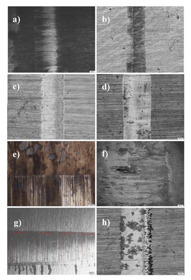 Optical microscope images (×500) of the wear scar in the blocks after tests with the different lubricating fluids: (a) PAO6, (b) PAO6 + graphene, (c) ChCl-urea, (d) ChCl-urea + graphene, (e) ChCl-malic ac., (f) ChCl-malic ac. + graphene, (g) ChCl-EG, (h) ChCl-EG + graphene.