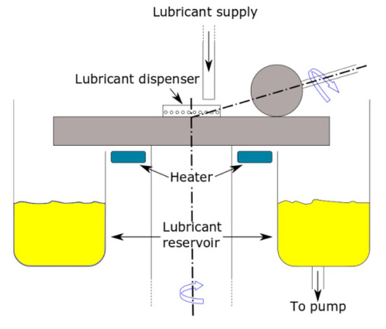 A ball-on-disc test machine, Wedeven Associates Machine (Wedeven Associates, Inc., Newtown Square, PA, USA), was utilized in this study. The schematic of the contact configuration is depicted in Figure 1. Both the ball and the disc are independently driven by electrical motors up to a speed of 25,000 and 12,000 RPM, respectively. The standard ball and disc specimen have a diameter of 20.63 and 101.00 mm, respectively. The lubricant flows into the contact from the lubricant reservoir through the lubricant dispenser in the middle of the disc to be evenly spread over the disc surface. The current setup measures three temperatures: the bulk lubricant temperature (reservoir), the lubricant outlet temperature from the lubricant supply, and the lubricant film temperature on the disc (next to the lubricant dispenser). For more details about the machine, see reference [6].