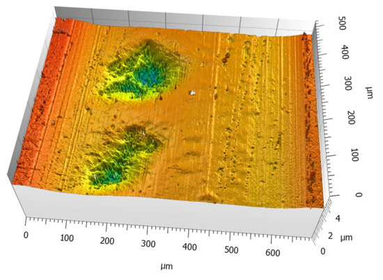 An example of local micro-pitting damage of ball surfaces lubricated with two different oils for transverse roughness lay at different lambda ratios is depicted in Figure 8 and Figure 9. Where, Figure 8 presents light optical images of micro-pitted surface (over-rolling direction from right to left) and Figure 9 shows the same surface (rotated for 90° counter-clockwise) captured with the optical 3D profilometer with local micro-pitting damage assessment.