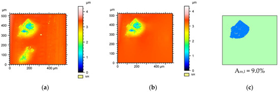 The local micro-pitting damage is assessed within the same area domain. However, local damage is considered as a single micro-pit. An example of micro-pitted damage and assessment of local micro-pitting damage is depicted in Figure 2 and Figure 3, respectively. For the surface shown in Figure 3, case (a), micro-pitting damage is located and captured within the area domain; for case (b), the largest single micro-pit is isolated; and (c), the ratio of the local micro-pitted area (percentage of local micro-pitting) to the area domain is determined. The assessments were only done on the balls as micro-pitting always develops on the smoother surface, in this case, the ball [20].