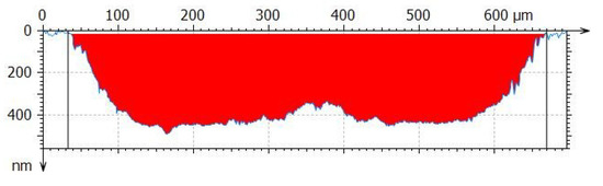 Example of wear measurement from Test 1 showing the cross-section of a wear track. This results in wear damage, = 231 µm2, after normalization = 284 µm2, which correspond to the normalized loss of material in volume, = 0.018 mm3.