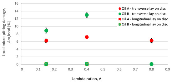 As seen in Figure 5, the local micro-pitting damage for the transverse lay is the highest at the intermediate lambda for both oils. On the other hand, the local micro-pitted damage for the longitudinal lay was almost completely eliminated for all lambda ratios, except for Λ = 0.8 since this test was not conducted, and no clear difference was observed between both tested oils. It appears evident that the local micro-pitting damage is definitely a function of roughness lay, where transverse lay induces more fatigue micro-cycles and, in turn, accelerates micro-pitting damage. Furthermore, it was also shown that under the same operating conditions, longitudinal roughness deforms more than transverse roughness, and by doing so promoting better lift-off [28,29]. Clearly, the lay direction of the pattern has an influence on micro-pitting formation.