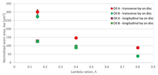 Nevertheless, wear damage seems to show dependence on roughness lay, and the transverse roughness lay is dependent on oil used. In the case of using a different roughness lay, the wear damage is higher for the transverse lay compared to the longitudinal, as previously shown [8]. It seems that not only micro-pitting but also wear damage is enhanced due to transverse roughness lay. This can be again contributed to worse lift-off behaviour [28,29] and more induced fatigue micro-cycles for the transverse lay. When comparing both oils for transverse lay, wear is higher for oil A compared to oil B. Type of base oil affects the wear process for the transverse roughness lay but does not necessarily affect the wear process for the longitudinal lay.
