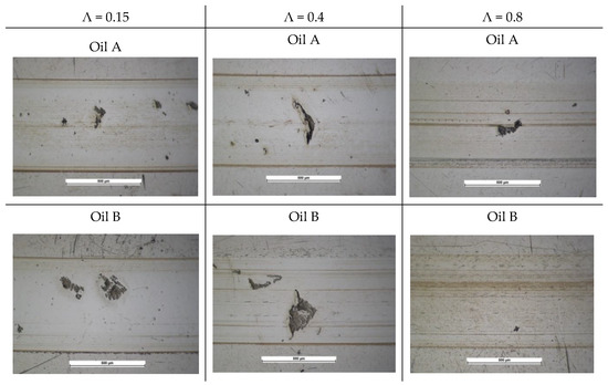 Light optical microscope (LOM) images—Example of local micro-pitting damage of ball surfaces lubricated with two different oils for transverse roughness lay at different lambda ratios.