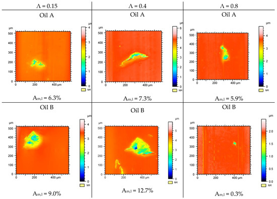 Optical 3D profilometer images—Example of local micro-pitting damage of ball surfaces lubricated with two different oils for transverse roughness lay at different lambda ratios.