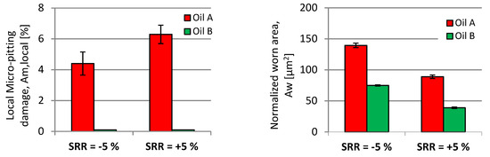 Two different slide-to-roll ratios were selected for this study: +5 and −5 percent in order to see how this affects micro-pitting and wear damage. Other operating conditions were kept constant at lambda 0.8 using the transvers roughness lay on the disc. Table 5 shows how many revolutions perform the ball and the disc, for both negative and positive SRR. For this investigation, only sliding distance was set constant for both tests, this, in turn, lead to constant number of micro-revolutions induced by the roughness. The local micro-pitting and wear damage for both oils are depicted in Figure 11.