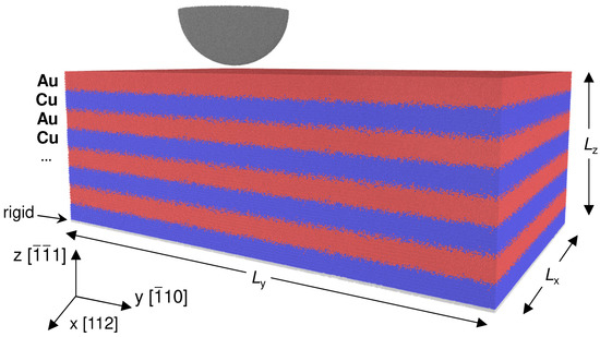 We here use molecular dynamics (MD) simulations to study scratching of a specific class of materials that are nanostructured by design and therefore have an intrinsic scale that is on the order of the radius of an AFM tip. Metallic nanolaminates, often also called heterostructures or multilayers, consist of layers of pure metals or alloys of alternating composition and structure [19,20] that are typically grown in sputter deposition processes. In bulk composites, mechanical properties can often be obtained from rules of mixture but this simple description no longer holds for nanolaminates. The nanolaminates’ exceptional properties can be connected to two associated factors, the reduction in layer thickness to the intrinsic scales of dislocations, such as the Burgers vector or the splitting distance of Shockley partials and the importance of interfaces in the system [21]. These metallic nanolaminates not only exhibit enhanced strength and hardness [20,22,23,24,25], wear resistance [26,27] or toughness [28] but also offer the possibility to tailor those properties by choosing material combinations [29]. Metallic nanolaminates have been characterized using indentation [3,4] and scratch [5] experiments but not yet using tips of nanometer size.
