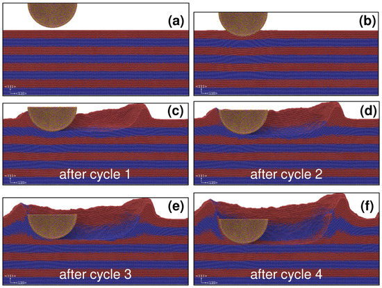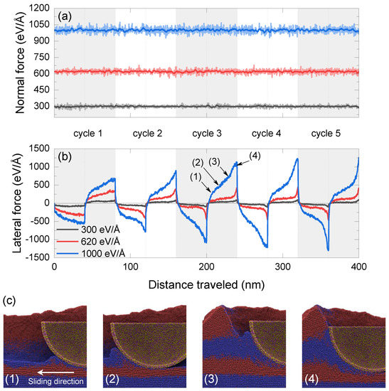 The frictional strengthening observed in Figure 4b can be rationalized by the indenter displacing material into the sliding direction as shown in Figure 4c ((1)–(3)). The pile-up of material in front of the indenter facilitates flow of material towards the ends of the wear track. This happens because the pile-up distributes the force over a cross-sectional area that is increasing with sliding distance (leading to lower stresses) but also because the material inside the pile-ups is hardened [15,16]. The rapid rise in lateral force in Figure 4b, found in the region indicated by arrows (3) and (4), corresponds to the indenter pushing plowed material against the wall of the slide track upon reaching the dead center. This mode of deformation has been experimentally observed on Ag|Cu multilayer with layer thickness ranging from 4 nm to 20 nm [27]. In both simulations, the forces observed in the first two cycles corresponds to a friction coefficients ranging from 0.25 to 0.75 which are in good agreement with friction of coefficient for dry contact sliding of metals [54]. The friction coefficients are the average lateral force divided by the average normal force, derived from the value of the onset lateral force and final lateral force upon reaching the dead centers (approx. 250 and 750 eV Å for the 1000 eV Å calculation).