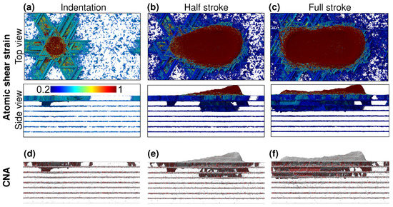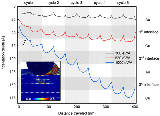 We first discuss the results obtained for a normal force of 1000 eV Å. During the initial indentation (Figure 2a and Figure 3) the indenter did not penetrate entirely the first Au layer. Figure 5d shows a significant density of stacking faults right underneath the indenter. As expected by various models such as the Hall-Petch or confined layer slip (CLS) [48,49,50], at such a small scales the interface plays a critical role blocking dislocations, since there is no space for dislocations to pile up. The accumulation of defects is therefore responsible for the hardening of the single crystal Au layer, allowing the indenter to only penetrate a fraction of its depth. The sudden increase in indentation depth at the onset of sliding, marked by an arrow in Figure 3, can be explained by a sudden burst of dislocation activity in the third layer while the indenter remains above the first interface. The burst of dislocations and therefore plastic deformation is clearly captured by the atomic strain analysis shown in the inset of Figure 3. During the whole indentation process, part of the dislocations leave the contacting regions as prismatic half-loops parallel to the surface, leading to sixfold symmetric deformation patterns (Figure 5a). Identical patterns have been observed in experiments [51,52], discrete dislocation dynamics [53] and molecular dynamics simulations [13].