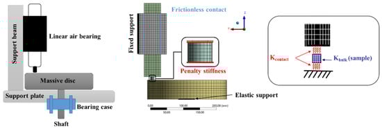 A hexahedral-dominant mesh was used in the numerical model. Each 3D solid element had 16 nodes, for a total of 48 degrees of freedom. The model was composed of four main bodies—the disc, the guide bar, the air bearing, and the specimen. For each body, a linear elastic material law had taken into account with the following parameters:
