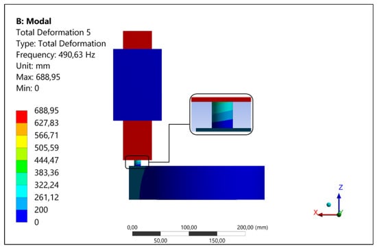 The results were also compared with the ones obtained numerically when using the contact stiffness calculated by the numerical software as default, i.e., Kc = 6 × 1013 (Pa/m). The comparison with the experiment highlighted a crucial difference in terms of the natural frequency of the considered system mode, confirming the unrealistic values of the contact stiffness in the commercial codes, which was overestimated and therefore led to an overestimation of the mode frequency (Figure 7). In fact, the contact stiffness calculated by the software did not account for the interface features, such as roughness or presence of a third body.