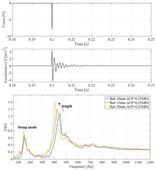 (Top) Acceleration and force signals over time, due to the impact excitation for a single measurement. (Bottom) FRFs of the system for different lengths (10, 15, 20 mm) of the tested samples. Tests were performed with average contact pressure (ACP) of 0.25 MPa and surface roughness of Ra = 6 µm.