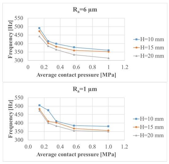 After computing the FRFs as a function of the average contact pressure, sample length and sample roughness (as in Figure 5), the frequency evolution of the investigated mode is plotted in Figure 6. A decrease in the natural frequency as a function of the contact pressure was observed for both Ra = 1 µm and Ra = 6 µm. The decrease in frequency was due to the increase of the added mass weight needed for varying the contact pressure in the experiments.
