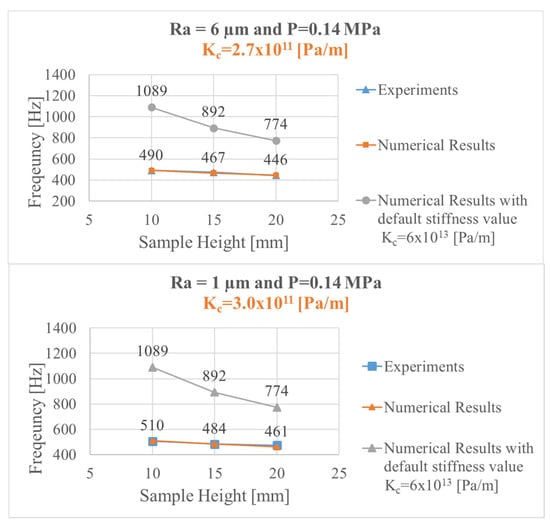 Figure 7 shows a comparison of the results related to the numerical and experimental tests in terms of the natural frequency of the investigated system mode. The numerical value of the normal contact stiffness, introduced in the contact model by penalty formulation, allowed for obtaining a quantitative agreement between the experiments and the numerical results, in the case of an average contact pressure of 0.14 MPa. The identified contact stiffness was Kc = 2.7 × 1011 (Pa/m) and Kc = 3 × 1011 (Pa/m) for a surface roughness of Ra = 1 µm and Ra = 6 µm, respectively.