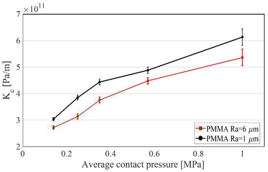 Then, the contact stiffness was identified, through comparison with the experiments for both Ra = 1 µm and Ra = 6 µm, as a function of the average contact pressure. In Figure 8 the trend of the contact stiffness as a function of the average contact pressure for both the surface roughness, Ra = 1 µm and Ra = 6 µm is presented. The respective error bars were calculated on three different samples for each test condition. The increase in contact stiffness as a function of the contact pressure was also confirmed from the results obtained by Xi Shi and Polycarpou in [], for a dry contact system.