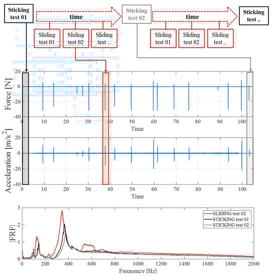 From top to bottom—force signal and acceleration response; spectrum related to the sticking test 01 (black curve), sticking test 02 (grey curve), and sliding test at time t = 28 s (red curve). Sample length H = 10 mm, roughness parameter Ra = 6 µm, and imposed average contact pressure of P = 0.35 MPa. Hammer impacts and the corresponding FRFs were performed during the sliding evolution of the interface.