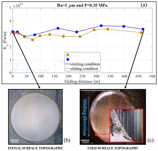(a) Evolution of the contact stiffness (disc/sample) for the sample with H = 10 mm, Ra = 1 µm, and average contact pressure of 0.35 MPa. Blue dots are associated to the contact stiffness values estimated in sticking condition while orange dots are associated to the contact stiffness values estimated in sliding condition; (b) Topography of the initial contact surface of the sample; (c) Topography of the contact surface of the sample at the end of the measurement campaign.