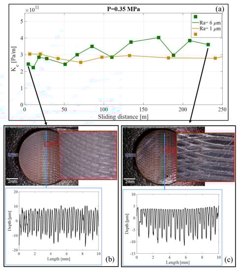 Figure 11a shows a comparison of the contact stiffness evolution in the sliding conditions for two values of the initial roughness, Ra = 6 µm and Ra = 1 µm, for a sample of H = 10 mm and an average contact pressure of P = 0.35 MPa. The results confirmed the trend of the contact stiffness recovered in the sliding condition, for both roughness values. It could be noted that, while the contact stiffness for Ra = 6 µm was lower at the beginning of the sliding, it became larger than that of the surface with Ra = 1 µm, after a run-in of the surfaces. In fact, at the beginning of the test, the lower stiffness was obviously a consequence of the higher roughness; afterwards, the smoothening of the asperities and filling of the roughness by the third-body (Figure 11c), made the interface more compact, bringing to a higher contact stiffness.