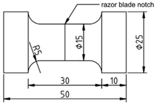 The fatigue tests were conducted with dumbbell specimens on a dynamic mechanical analyzer (ElectroForce 3450, TA Instruments, New Castle, DE, USA). The tests were carried out in the load-controlled mode with a sinusoidal signal. The frequency used was 3 Hz, which is a compromise of test duration and thermal influence. The specimen geometry is shown in Figure 1. In the middle of the specimen, a sharp circumferential initial notch (depth ≈ 1 mm) was introduced using a razor blade (thickness = 0.1 mm, tip radius <5 mm), which was mounted on a lathe. After the tests, the area of the fracture surfaces was measured with optical microscopy (Stereo Microscope SZX 12, Olympus, Tokyo, Japan). The calculation of the stress was based on the fracture surface measured. To investigate the influence of the temperature on the fatigue property of unfilled and filled TPUs, tests were conducted at room temperature (23 °C, 50% RH) and 80 °C.