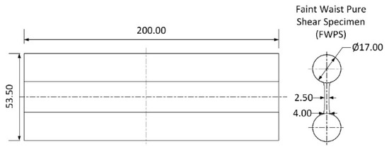 To investigate the crack growth behavior, pure shear tests were conducted. To ensure a horizontally growing crack, faint waist pure shear (FWPS) specimens were tested. When using these slightly curved specimens, Equation (3) (Wh0 = T) is not valid. However, the thickness was assumed to be constant, thus justifying that it should only provide information on the conductibility and a possible trend. The geometry of an FWPS specimen is illustrated in Figure 2.
