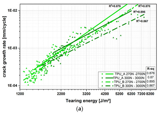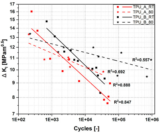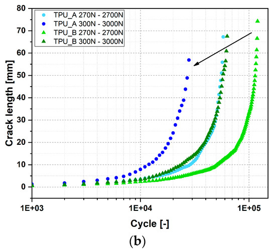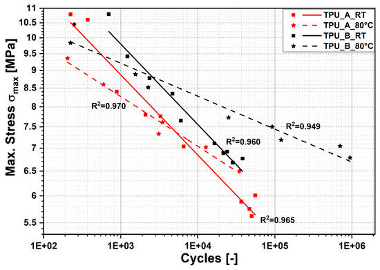 where N is cycles to failure, is the maximum stress, and and k are constant. As shown in Figure 3, the curves of both materials at room temperature are parallel, indicating that fillers in TPU_B are beneficial for these kinds of fatigue tests at room temperature. However, the reinforcement effect of the filler against fatigue is not because fillers strengthen the crack growth resistance of TPU_B, but rather because they increase the E-modulus. Under the same conditions, TPU_B experienced approximately double the time to fail as TPU_A.