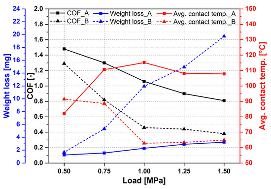The PoD tests were conducted with a rotating speed of 150 mm/s at a load of 1 MPa for 4 h, later shortened by UMT-2 rot. To compre between both test setups, the RoD tests were conducted at 150 mm/s and 4 h of testing. To gain some information about the influence of the load, two different load levels were chosen, namely 1 MPa and 1.5 MPa. These load ramp tests were developed by Jölly for TPU materials [24]. The results of the load ramp were shortened by TE LR. For lower loads, the filler cannot evolve its lubricating potential [25]. Therefore, higher loads were chosen.