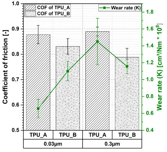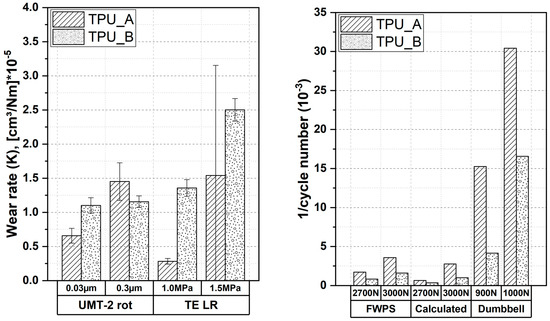 The depicted wear rates show a clear trend of higher wear rates for higher loads. Except for TE LR, the wear rate for TPU_A is higher than for TPU_B, the reason being the previously mentioned running-in wear, which is required to develop a transfer film on the counterpart. This fact can also be argued with the required tearing energy of 2400 J/m2 to see a clear separation in Figure 5. It is possible that for both stressing types, mechanical and tribological, TPU_B needs a certain amount of energy or wear to develop its potential. This might be traced back to the filler, which acts to either stiffen or lubricate, depending on the mode of stressing. Even though TPU_B has a higher wear rate for the load ramp, the factor between the single loads and the counterpart roughness is smaller than for TPU_A. This includes the fact that TPU_B is less affected by higher stressing than the unfilled TPU_A. For mechanical testing, the inverse values of the fatigue cycle numbers were taken. The higher values of the wear rates calculated from the dumbbell specimen are due to the relatively small area of the specimen, which is more affected by higher loading. While the pre-notched area for a dumbbell specimen is around 130 mm², the area for a pre-cracked FWPS specimen is over three times higher, with 437.5 mm². Furthermore, it has to be mentioned that dumbbell specimens contain different stressing situations compared to the FWPS specimen.