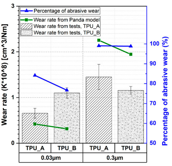 Based on the values in Table 4; Table 5 and our tribological tests under the same conditions, wear rates were calculated. As shown in Figure 8, TPU_B has a better wear resistance to both counterpart roughnesses than TPU_A. However, in the experiments, only when it runs against a rough counterpart is the predicted trend consistent with the experimental results. For tests with a smooth counter surface, the predicted value is lower than the experimental results. This can be attributed to adhesive wear, which is included in this model, but for a smooth counter surface, especially when the transfer film is formed, adhesion turns out to be one of the primary wear mechanisms [12]. With a transfer film in the interface, abrasive wear can be reduced significantly. Moreover, as the blue line shows in Figure 8, for the rough counterpart, abrasive wear contributes to more than 96% of the total wear volume. For the tests with a smooth counter surface, abrasive wear is still dominant, but fatigue wear is higher than that with a rough counter surface.