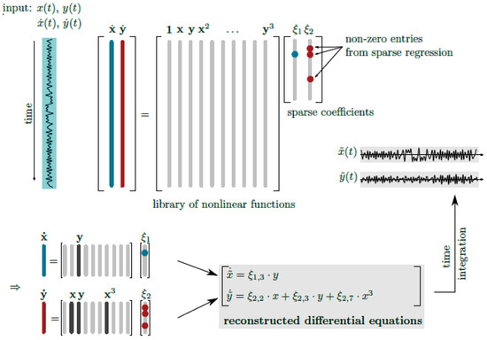 where represents the state of the system at time t and the nonlinear function represents the dynamic constraints that define the equation of motion of the system. The function f often consists only of a few terms, making it sparse in the space of possible functions. To determine function f from data, a time history of is collected, is measured or approximated numerically from the states and they are collected in the matrices and . Next, an augmented library, consisting of candidate nonlinear functions of , is constructed; it may consists of constants, polynomials (such as ), trigonometric functions, and other terms. Each column of represents a candidate function for the right-hand side of Equation (1). Only a few of these functions are active in each row of f, so a regression problem is set up to determine the vector of coefficients that determine which nonlinear functions are active for each degree of freedom