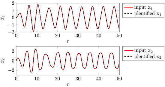 Comparison of input and identified time series using polynomials up to order . As the identified system has the exact reference coefficients, there are no differences in the trajectories.