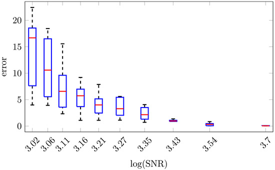 Box plots of reconstruction error computed for several values of noise indicated by the SNR. The test has been iterated 10 times for each value of . MATLAB function ‘randn’ is used to compute the matrix Z used to add noise to data. The value of SNR plotted for each is the logarithm of the mean value of SNR of the 10 repetitions.