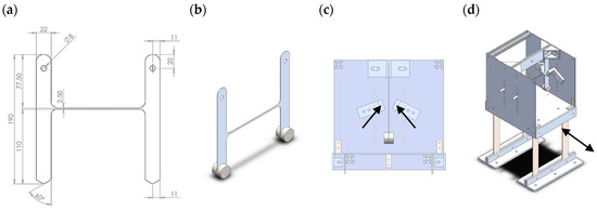 Panel (a) depicts the technical drawings with all relevant dimensions in (mm) and panel (b) depicts an isometric illustration of the two beams with added masses at the tips. The beams will be clamped at their upper end. (c) rigid stoppers indicated by arrows near one beam of the system; panel (d) shows an isometric view of the whole assembly with the forcing indicated by an arrow.