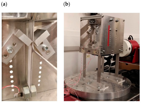 The physical system is constituted of two clamped-free cantilevers coupled to each other by a slander connection and with masses attached at the tip of each blade and subjected to base excitation, see Figure 6. The structure was machined by means of electric erosion from a 1.5 mm thick aluminum sheet. Moreover, two masses of 32.75 g each were glued at the tip of each beam in order to reduce the frequency of the first and the second bending mode of the structure. The dimensions of the system are indicated in Figure 6a.