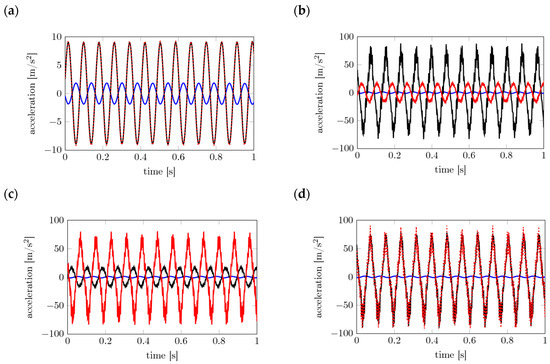 Accelerations measured in time-domain. Panel (a) displays the linear regime, i.e., without contact to the stoppers (base acceleration amplitude m/s2), panel (b) depicts the localized state when just one beam touch the stoppers (base acceleration amplitude m/s2), while the panel (c) displays the case when only the second beam vibrates in large amplitudes (base acceleration amplitude m/s2). Panel (d) depicts the homogeneous state when both beams touch the stopper (base acceleration amplitude m/s2). All panels show in black measurement for the first beam, while the red lines are the same quantities for the second one. Blue lines depict the base acceleration, which for panel (a, b, c, d) respectively has amplitude m/s2 and frequency Hz.
