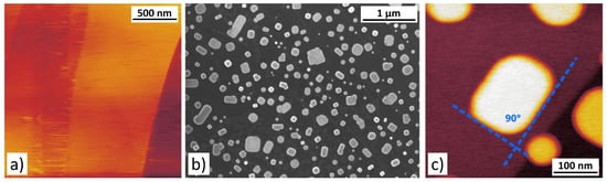 In addition to the AFM measurements, we transferred the samples to a scanning electron microscopy (SEM) in order to gain a more comprehensive overview over the samples. In the process, the samples were exposed to ambient conditions. Surprisingly, the SEM images (Figure 1b) revealed compact nanoparticles of mostly rectangular shape with rounded edges across the whole sample surface, although previous AFM measurements on the exact same sample showed no particles. Since the experimental conditions within the UHV-AFM and the scanning electron microscope are comparable, it appears likely that the unexpected transformation of the NaCl-coverage must be related to the exposure to ambient conditions between the measurements, which were performed in two different set-ups.